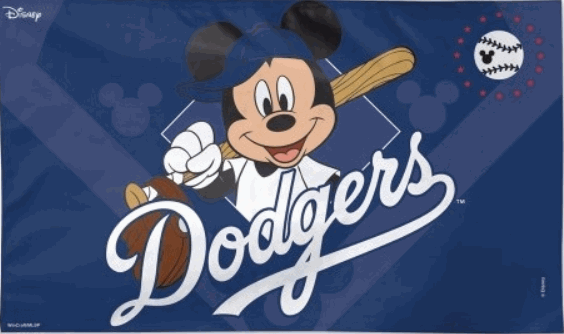 This Dodgers Fan Flag features Disney's Mickey Mouse. These flags are now being made for some of the MLB teams by WinCraft and Heartland Flags. This one is also officially licensed by the Los Angeles Dodgers. The Dodgers version of the flag features Disney's Mickey Mouse in a Dodgers uniform with bat - the image and wording reads correctly on one side only with the opposite side being backwards.