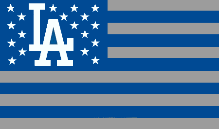 These popular variants of the American national flag have been produced for all the MLB teams and displayed by their enthusiastic fans. In the canton of the first illustrated here the white stars of the national flag have a Dodgers cap logo superimposed over the stars on a blue field. The 13 red and white stripes in the fly have been replaced with the white and blue colors of Los Angeles Dodgers.