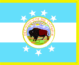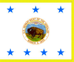 Secretary of the Interior - 52 x 66 inches, oriental blue with the departmental seal, 26 inches in diameter, on the center. Across the top of the flag are three stars and across the bottom four more, white, fitting within imaginary circles 5 inches in diameter. The seven stars represent the seven principal subdivisions of the department when this flag was adopted: Bureau of Indian Affairs, Bureau of Reclamation, National Park Service, Bureau of Land Management, Bureau of Mines, Geological Survey, and Fish and Wildlife Service. Gold fringe and cord and tassels, spread eagle finial. Also exists as a vessel flag, 22 x 32 inches without fringe, and an automobile flag, 18 x 26 inches without fringe. (Source: 310 DM 5.3 and illustration 3).
