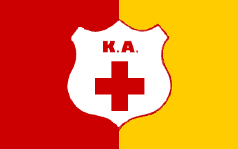 At the Arkansas Tech homecoming, the supplemental flag was also there, but it was a lot different from what we have now. The basic design is the same; a red and gold bi-color, split in the width, with a shield in white. On this shield is the red cross and the letters KA. There was no border around the shield and the letters did not have periods afterwards.