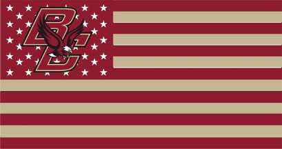 "On a field gules, above a trimount in base or, an open book argent edged of the second, thereon an inscription αιεν αριστευειν (Ever to Excel); on a chief sable between two crowns composed of alternate crosses patté and fleur-de-lis or, the badge of the Society of Jesus, azure and or.As mentioned, the arms on the flag are in maroon and gold only. Boston College is a university operated by the Jesuit order, with its main campus in Newton, MA, a suburb of Boston.