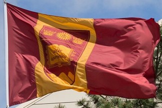 The flag is a vertical triband of the university's colors- maroon and gold. The 3 panels are of unequal width- the narrowest being the maroon hoist and the widest the maroon fly. On the central gold panel is a depiction of the university's arms in burgundy and gold. The actual colors of the arms, and a blazon, can be found at https://en-academic.com/dic.nsf/enwiki/960898. The arms are described as:
