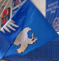 An academic flag of Kirkwood Community College is blue with the seal in yellow in the center.